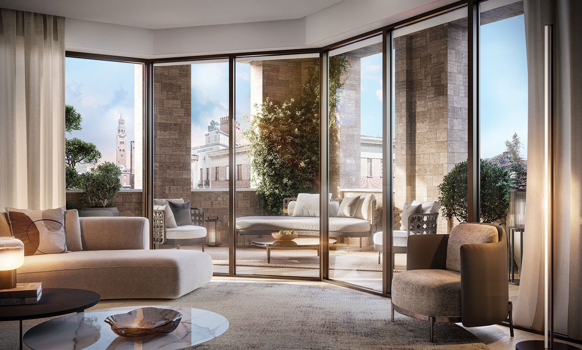 Le nuove terrazze e logge, arricchite da verde e schermature, migliorano comfort e qualità ambientale, mentre la copertura integra pannelli fotovoltaici capaci di ridurre il fabbisogno energetico. Palazzo Corteverdi diventa così un luogo esclusivo dove eleganza storica, innovazione e qualità dell’abitare si fondono in equilibrio.