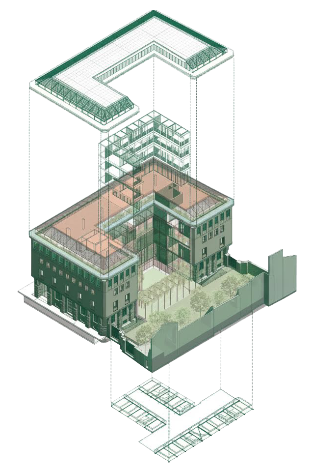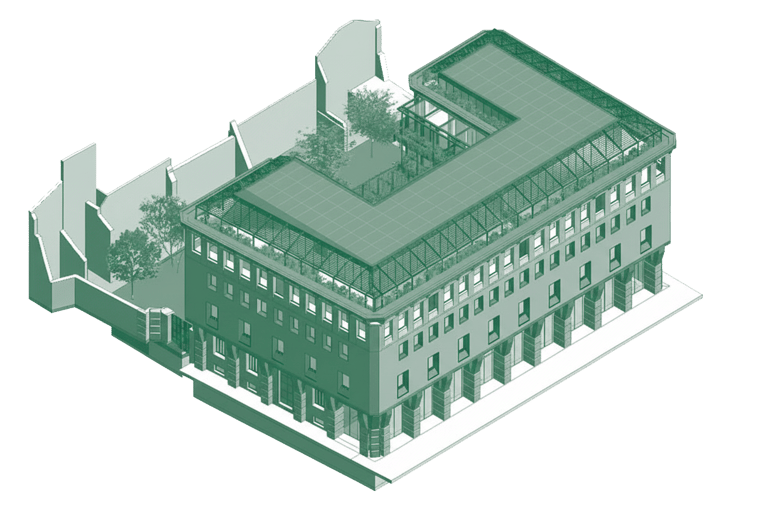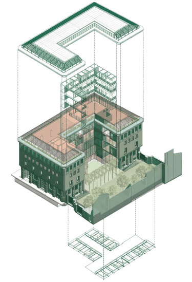 La corte centrale diventa un giardino verde permeabile, mentre il porticato su Piazza Stradivari si trasforma in uno spazio collettivo trasparente e luminoso, capace di ricucire la relazione tra edificio e spazio urbano. L’intervento preserva l’identità storica e la solennità dell’edificio, restituendogli leggerezza e vitalità.